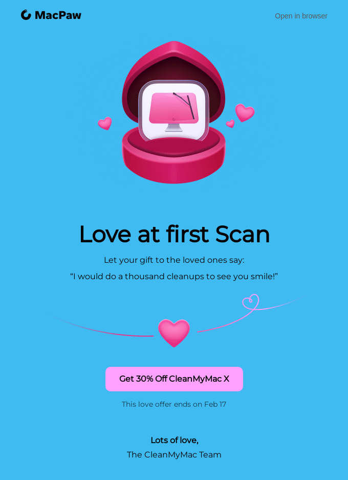 This email effectively combines humour, emotion, and practicality. By personifying CleanMyMac X as a gift of love, MacPaw positions its product as the solution for tech-savvy customers this Valentine’s Day. The 30% discount seasonal offer adds a sense of urgency as it expires on 17th February.