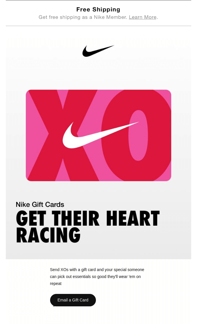 Nike’s Valentine’s Day email is all about channeling the energy of love into movement. By focusing on gift cards in this campaign, Nike makes this holiday more than just about traditional gifts.