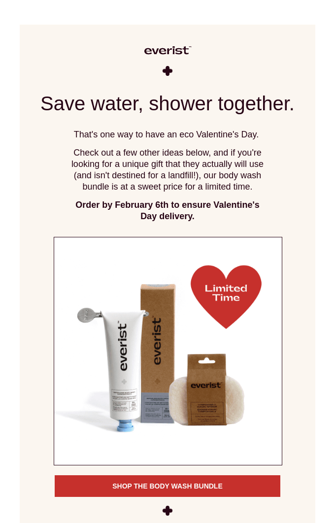 Everist seamlessly aligns its eco-conscious mission with the Valentine’s Day theme. The copy cleverly ties love to sustainability, inviting customers to “choose better for the planet”. By focusing on values like mindfulness and care, the email builds an emotional connection.